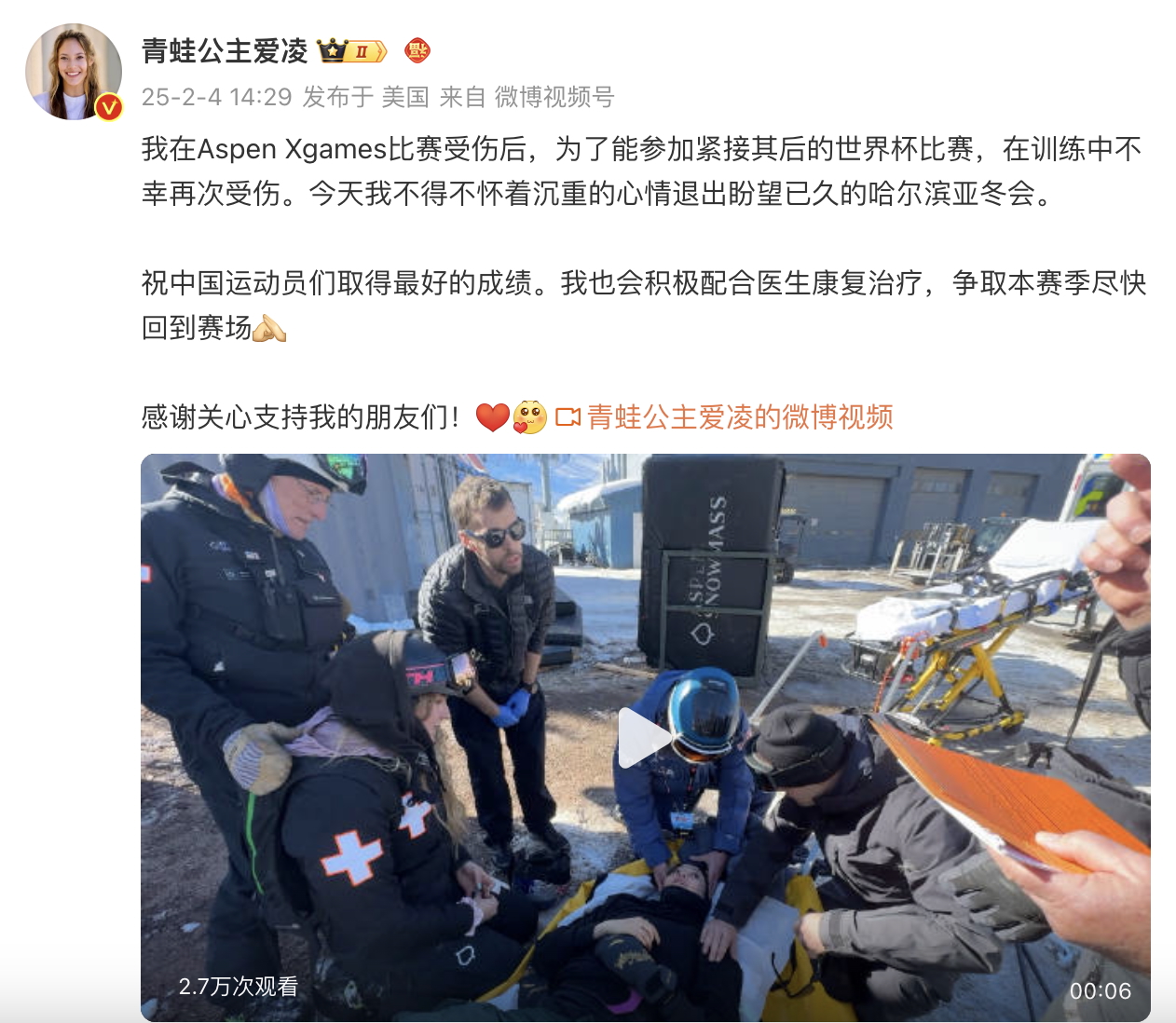 谷爱凌2月4日在微博发文:我在Aspen Xgames比赛受伤后,为了能参加紧接其后的世界杯比赛,在训练中不幸再次受伤。今天我不得不怀着沉重的心情退出盼望已久的哈尔滨亚冬会。