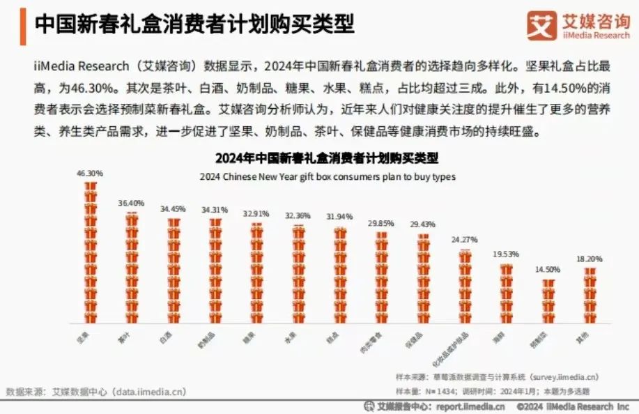 南北新年,就没有坚果治不好的“众口难调”。据艾媒咨询发布的《2024年中国新春礼盒消费者行为洞察报告》显示,坚果产品位居2024年中国新春礼盒消费者计划购买类型第一名,占比高达46.3%。