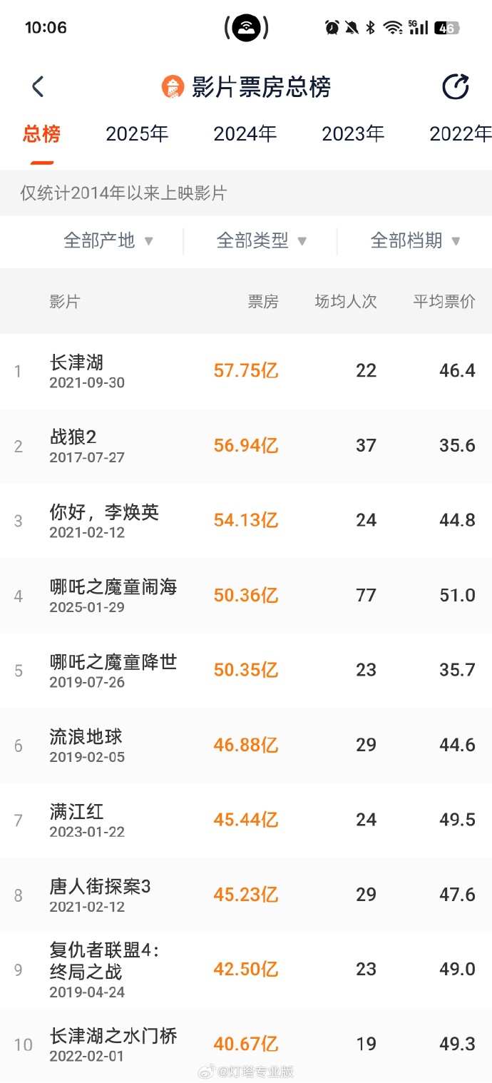 据灯塔专业版,截至2月5日10时6分,影片《哪吒之魔童闹海》票房突破50.36亿,超过《哪吒之魔童降世》进入中国影史票房榜前四。