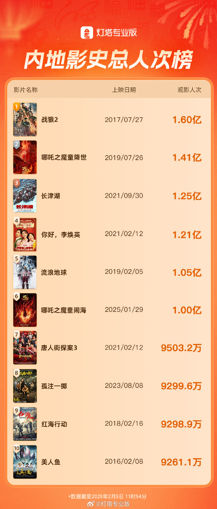 据灯塔专业版数据,截至2月5日11时54分,影片《哪吒之魔童闹海》观影人次突破1亿。