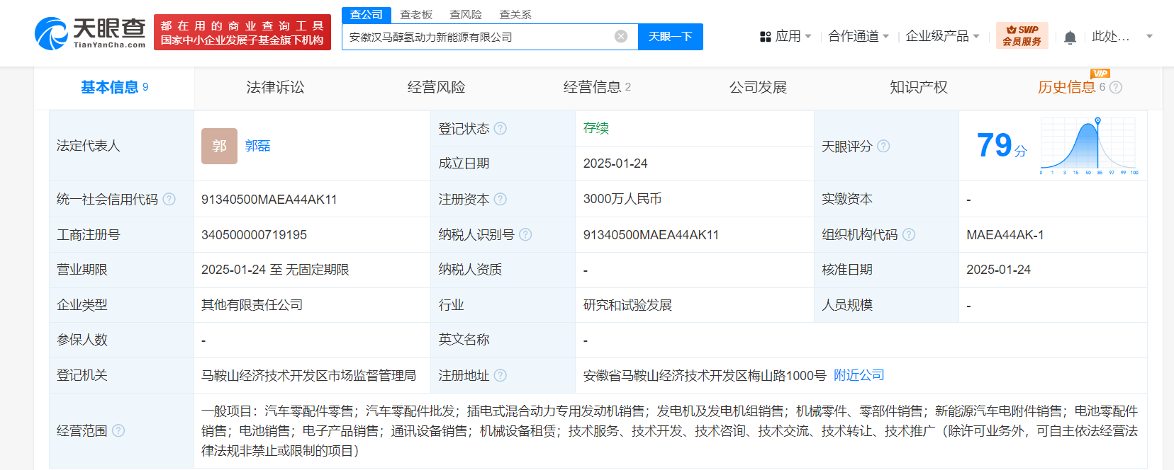 据每日经济新闻消息,天眼查App显示,近日,安徽汉马醇氢动力新能源有限公司成立,法定代表人为郭磊,注册资本3000万人民币,经营范围含汽车零配件零售、汽车零配件批发、插电式混合动力专用发动机销售、发电机及发电机组销售、新能源汽车电附件销售、电子产品销售等。股东信息显示,该公司由*ST汉马(600375)、马鞍山醇氢企业管理合伙企业(有限合伙)共同持股。
