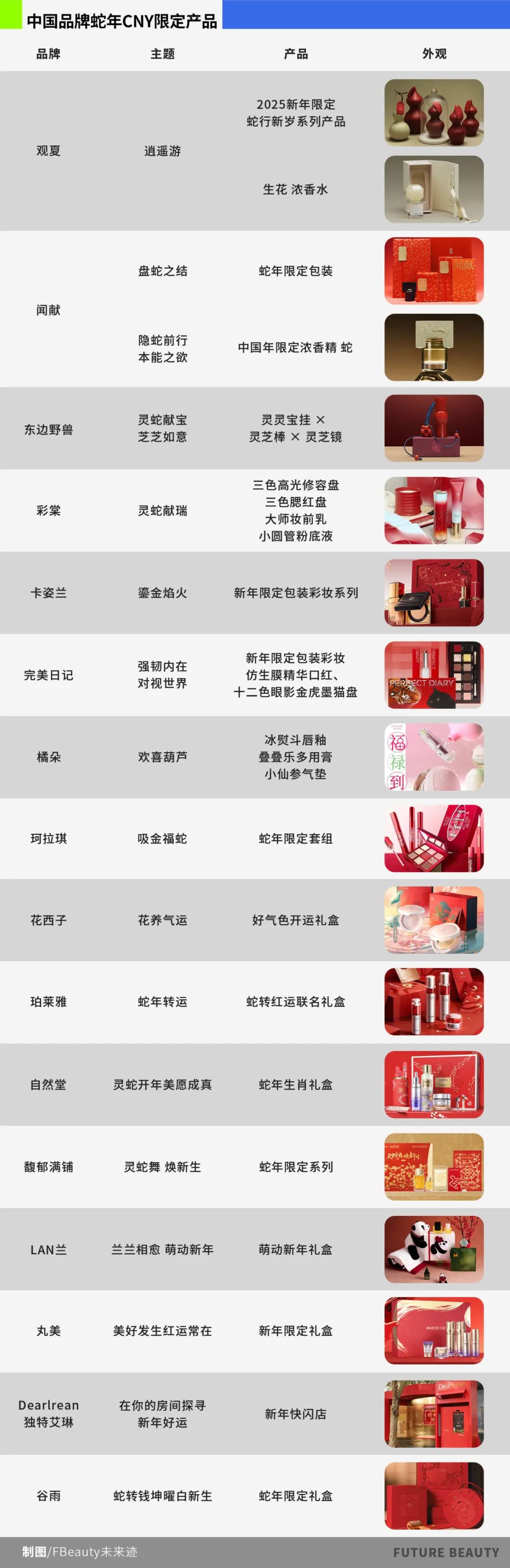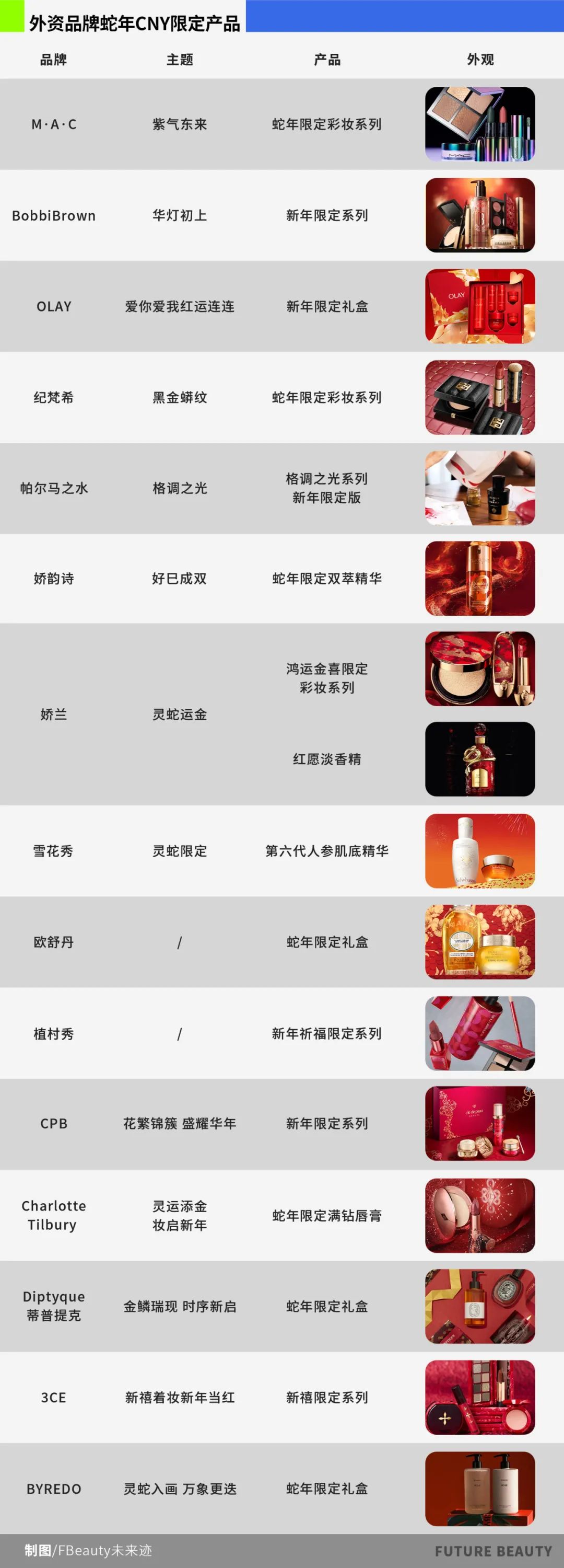 自去年12月开始,中外美妆品牌纷纷开始为新年预热,陆续推出新年限定产品与礼盒。《FBeauty未来迹》梳理了近30个品牌的新年限定后发现,品牌们的“蛇年限定”外观设计,大致可以分为三种方式。