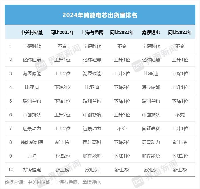 在中关村储能和上海有色网的榜单中,海辰储能去年的出货量排名第三,较2023年第五位的排名进一步提升。在鑫椤锂电的排名中,海辰储能位居第四,同样较2023年提升一位。