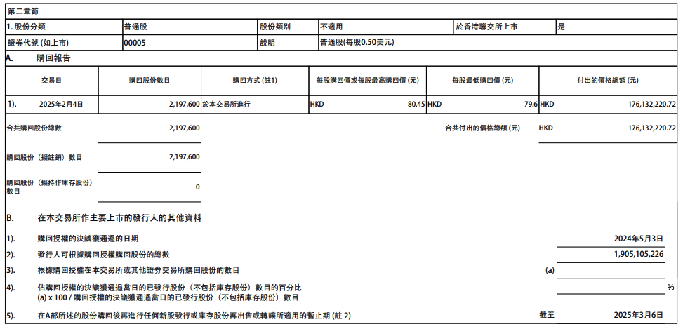 汇丰控股2月5日在港交所公告,公司于2月4日耗资约1.76亿港元回购219.76万股公司股份,每股回购价格79.6港元-80.45港元。
