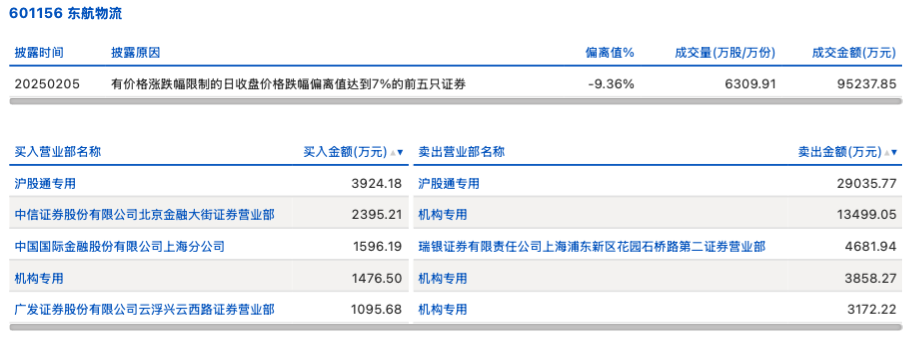 2月5日,东航物流今日跌停,龙虎榜数据显示,上榜营业部席位全天成交6.47亿元,占当日总成交金额比例为67.97%。其中,买入金额为1.05亿元,卖出金额为5.42亿元,合计净卖出4.38亿元。