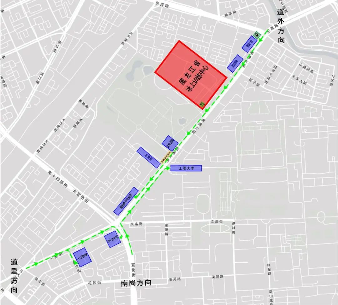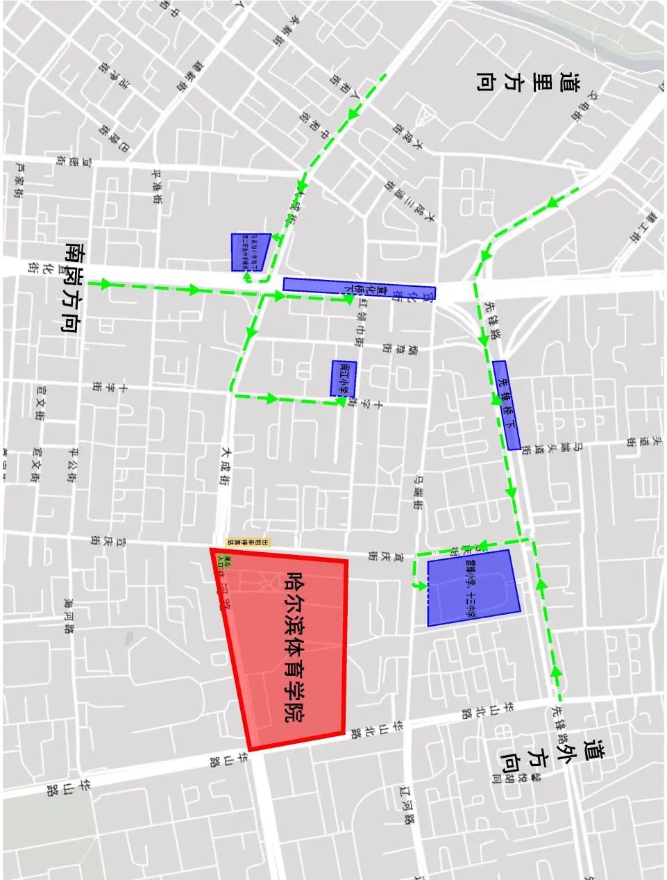 经一曼街可在新文街右转进入124中学操场或在宣化街右转进入69中(宣化分校)操场;经宣化街、南通大街车辆可在哈尔滨工程大学右转,进入工程大学公共停车场停放。