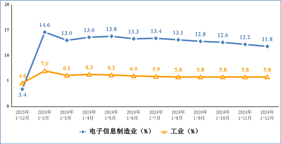 2024年,电子信息制造业固定资产投资同比增长12%,较1-11月回落0.6个百分点,比同期工业投资增速低0.1个百分点,比同期高技术制造业投资增速高5个百分点。