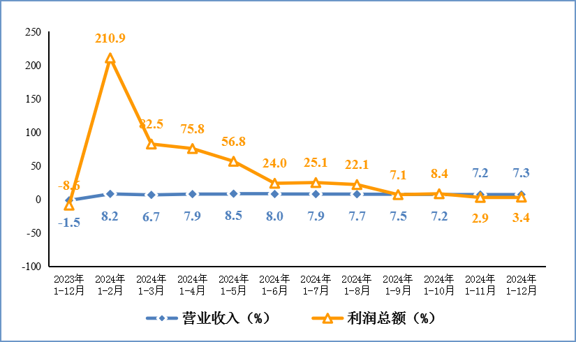2024年,规模以上电子信息制造业实现营业收入16.19万亿元,同比增长7.3%;营业成本14.11万亿元,同比增长7.5%;实现利润总额6408亿元,同比增长3.4%;营业收入利润率为4.0%,较1-11月提高0.04个百分点。12月份,规模以上电子信息制造业营业收入1.74万亿元,同比增长8.4%。