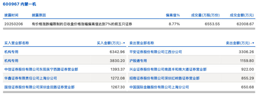 2月6日,内蒙一机今日涨停,龙虎榜数据显示,上榜营业部席位全天成交2.1亿元,占当日总成交金额比例为33.87%。其中,买入金额为1.41亿元,卖出金额为6894.04万元,合计净买入7211.88万元。