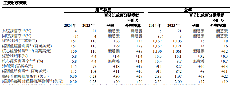 分业务来看,肯德基2024年总收入同比增长3%至约85.09亿美元;经营利润同比下滑1%至11.92亿美元;经营利润率下滑0.6个百分点至14%;全年的餐厅利润率下滑0.8个百分点至16.9%。