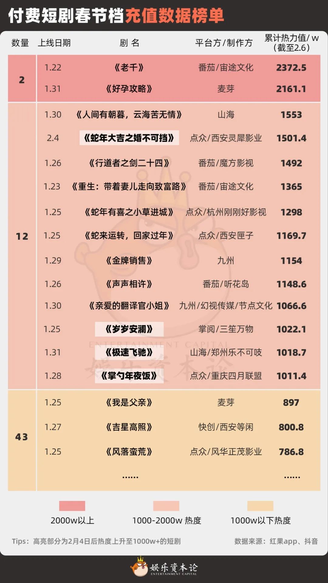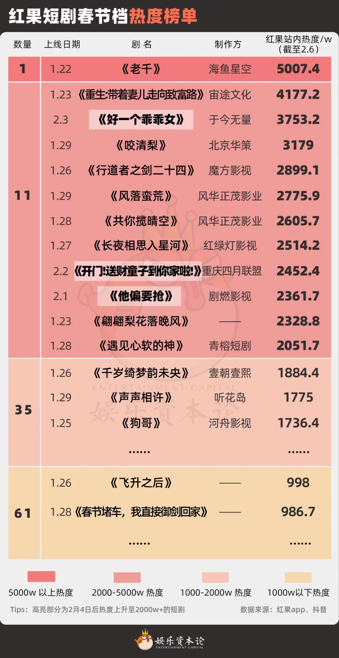 于今无量的《好一个乖乖女》在大年初六上线,开工第一天就在红果上达到2000w热度。重庆四月联盟的《开门!送财童子到你家啦!》投流端仅有400万,也是在昨日在红果上的热度涨到2000W以上。付费榜上,2月4日上线的《蛇年大吉之婚不可挡》连续两天榜一,总热力值已经攀升至1500w。