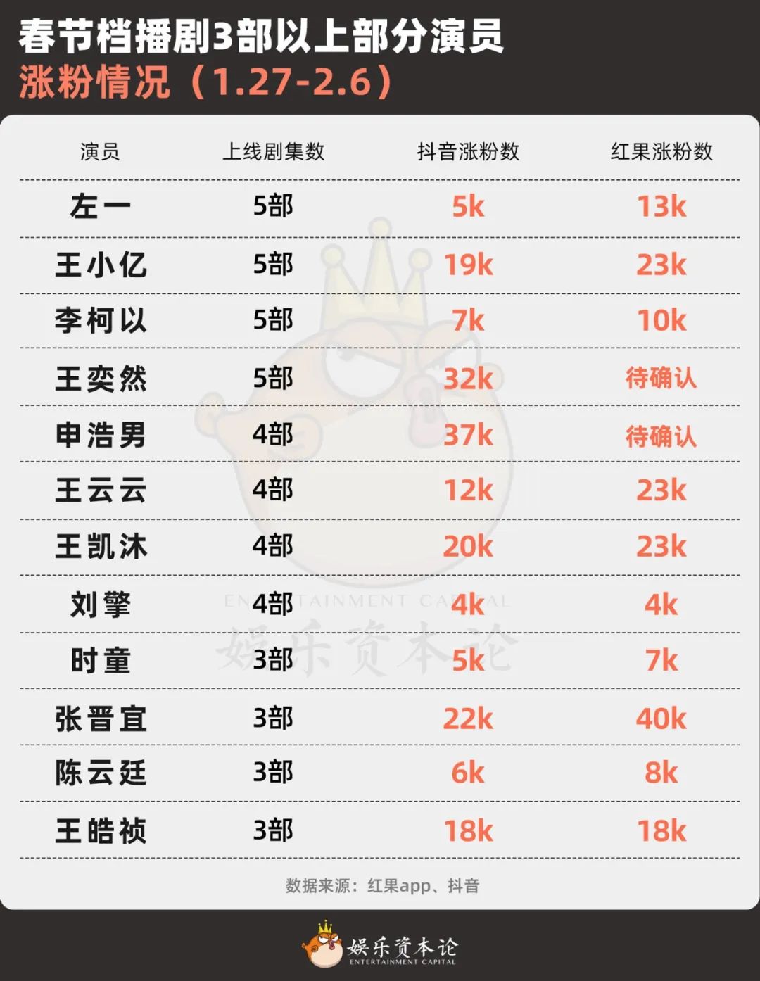 但此次春节档,虽然头部演员扎堆出演,涨粉效果却不明显。据娱乐资本论统计,1月27日至2月6日期间,大部分出演3部以上的演员涨粉仅在5000至2万之间。
