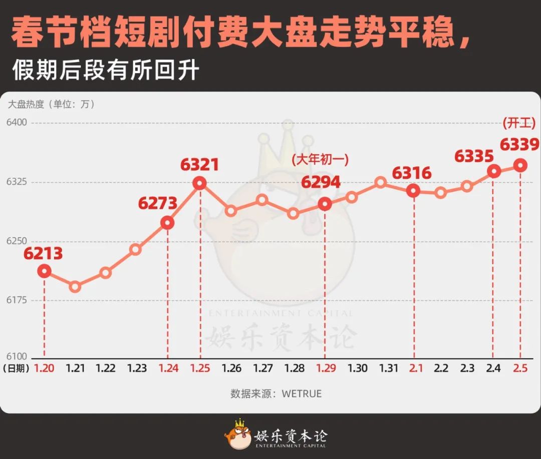 玲珑在大年初一发现,投流端榜一剧热力值和平时没有明显变化,她观察了几日,春节档大盘并没有走高,基本上每天四五百万热力值就能拿榜一,与节前相比并没有太多增长。而在之前,她预计榜一热力值至少能冲到千万以上。