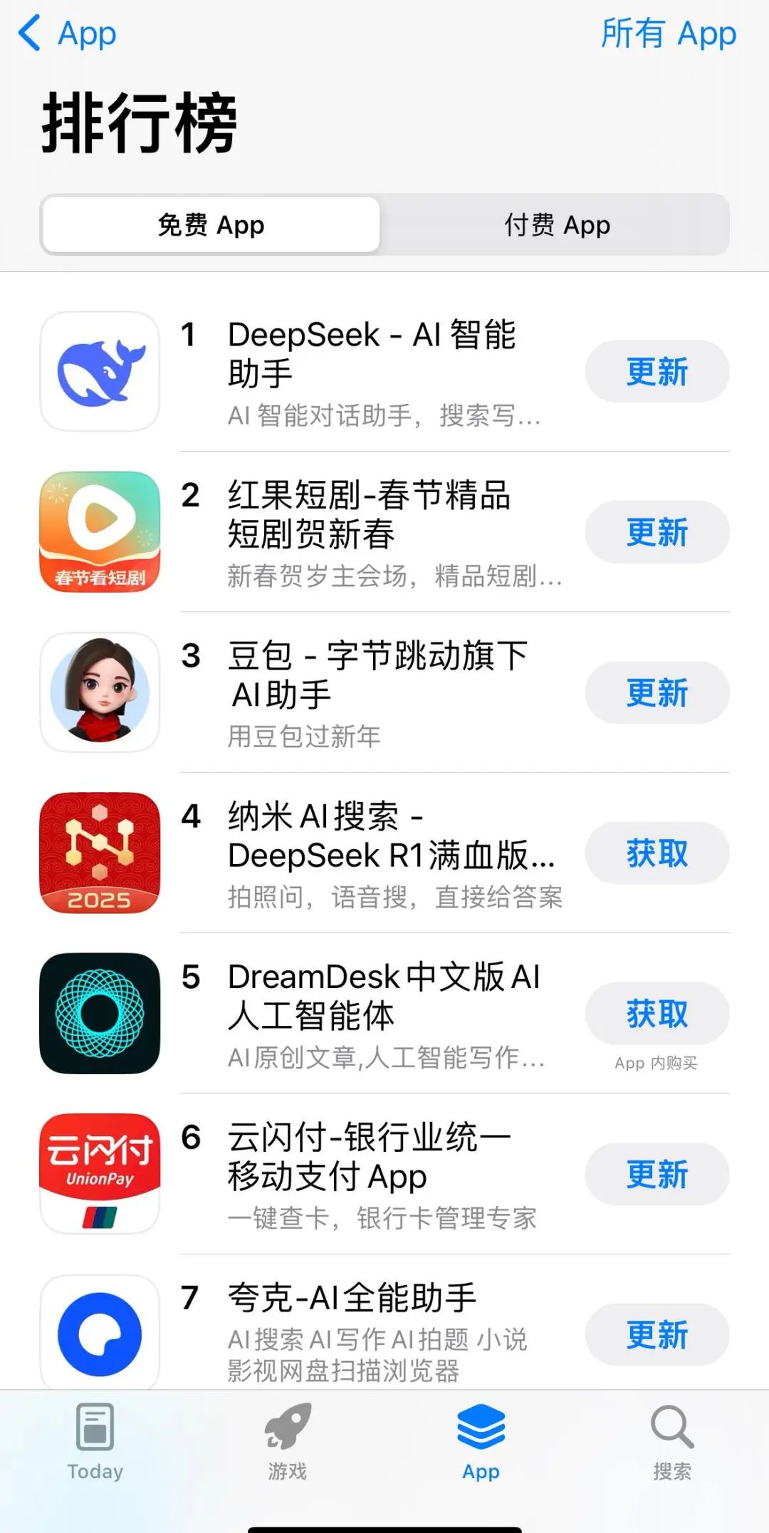 而红果也在一众AI相关app中冲到app store免费榜第二。