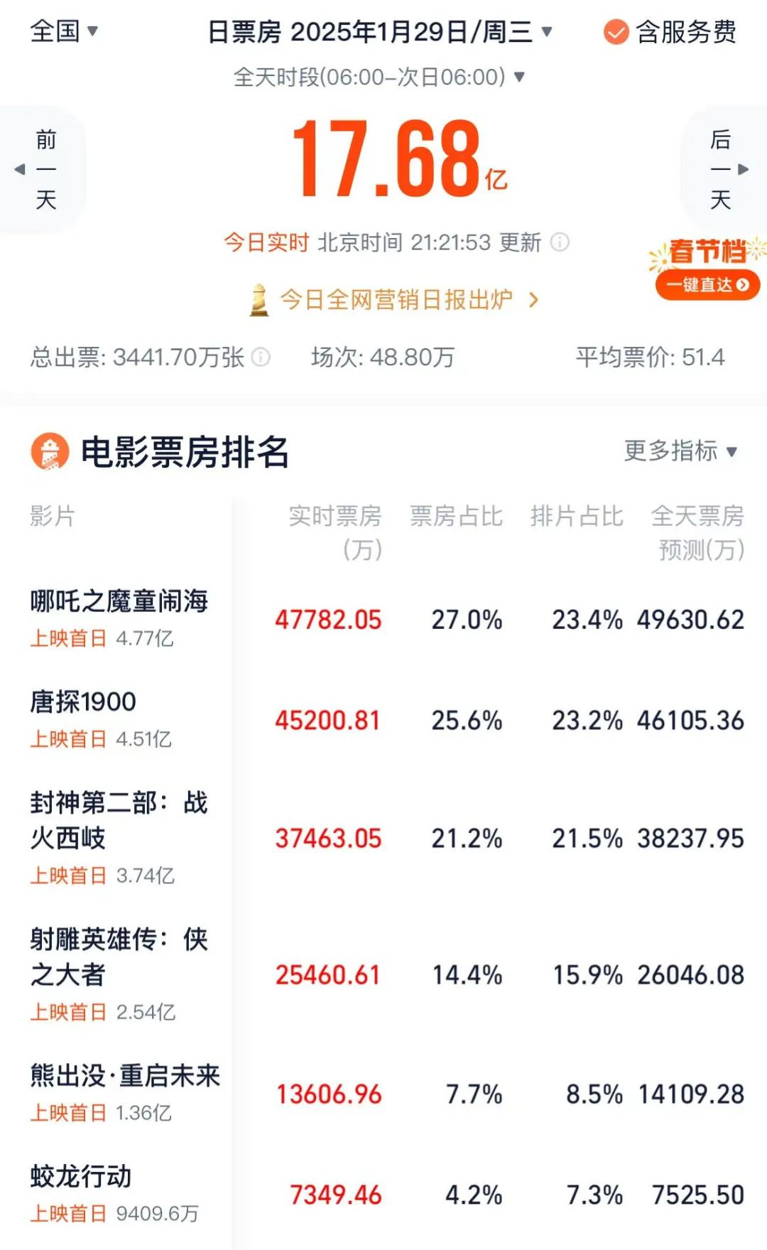 这样的高票房数字,并非如过往一样依赖飞涨的票价来实现。目前大年初一的平均票价为51.4元,比之最高时的2022年大年初一,足有4.6元的差距。总人次由此也实现了历史新高,同比去年增长了30%,可以说是观众用脚投票投出来的一届“最强春节档”。