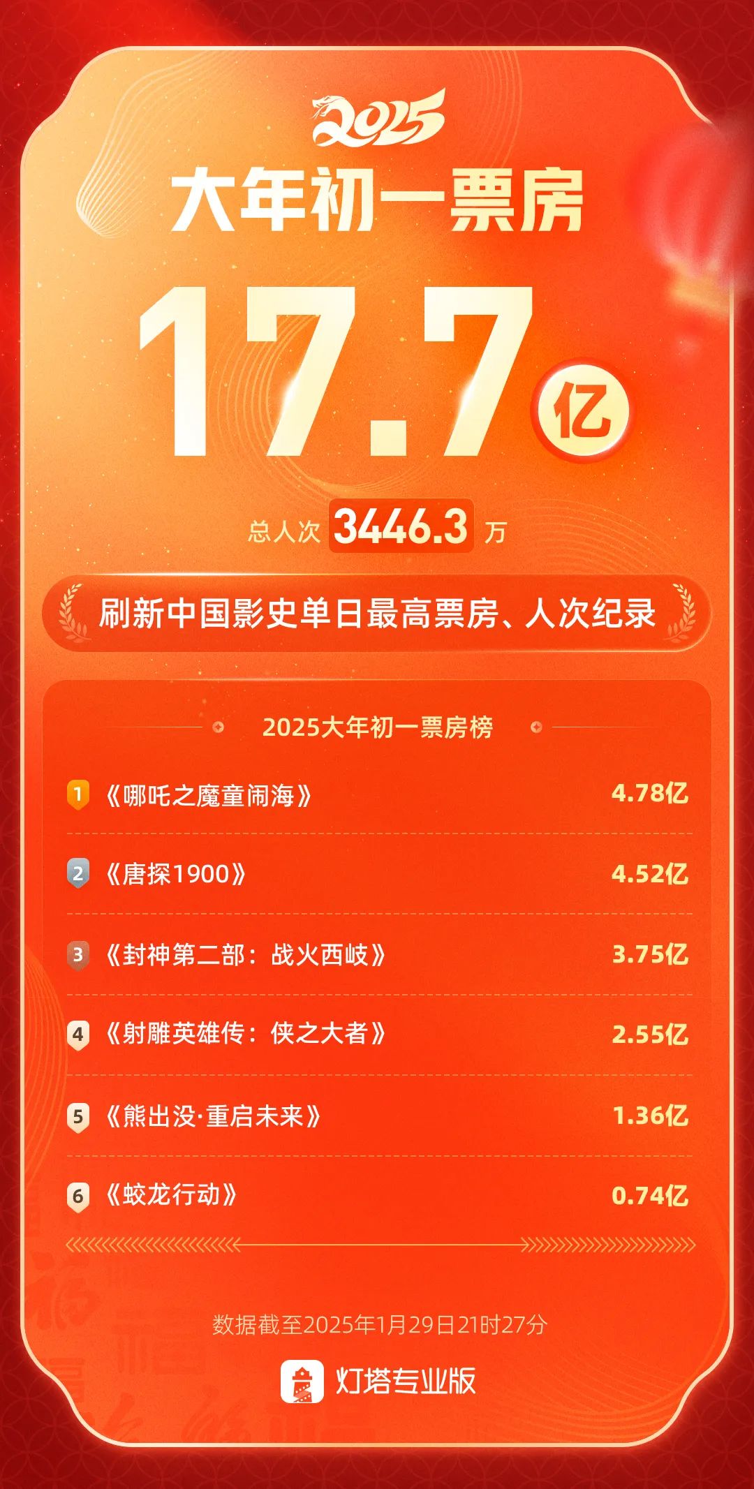 不要诧异于电影市场的红火,因为今天是中国电影历史上票房最高的一天。截至毒眸发稿前,大年初一的单日票房已经达到了17.91亿,总人次达3490万,还在继续冲击更高的数字。此前的单日票房纪录来自于2021年的大年初一,仅16.93亿,这一数字在今天的19:17就已经被打破。若与去年大年初一的13.47亿对比,这一数字在今天下午13:50左右便已经被超越,今日的最终预估票房将同比上升35%左右。