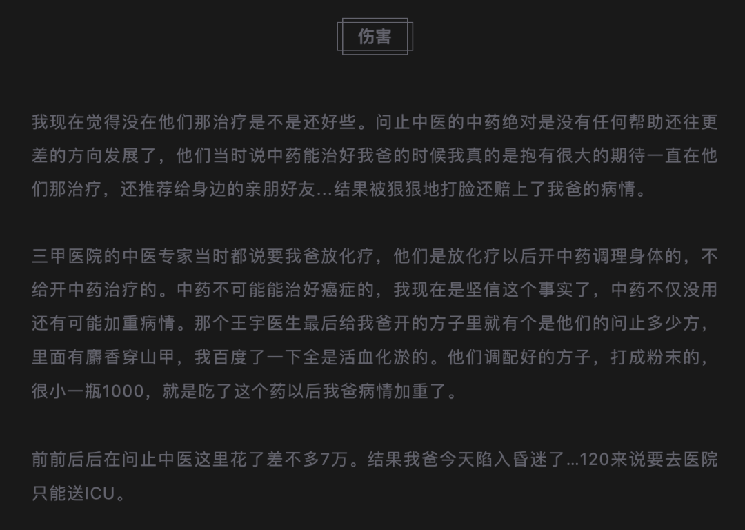 不过,这些数据并未打消外界的质疑。2024年6月,一篇由新媒体“互帮互助病友邦”发表的《相信问止中医,结果父亲被送进ICU》在社交媒体引发热议。
