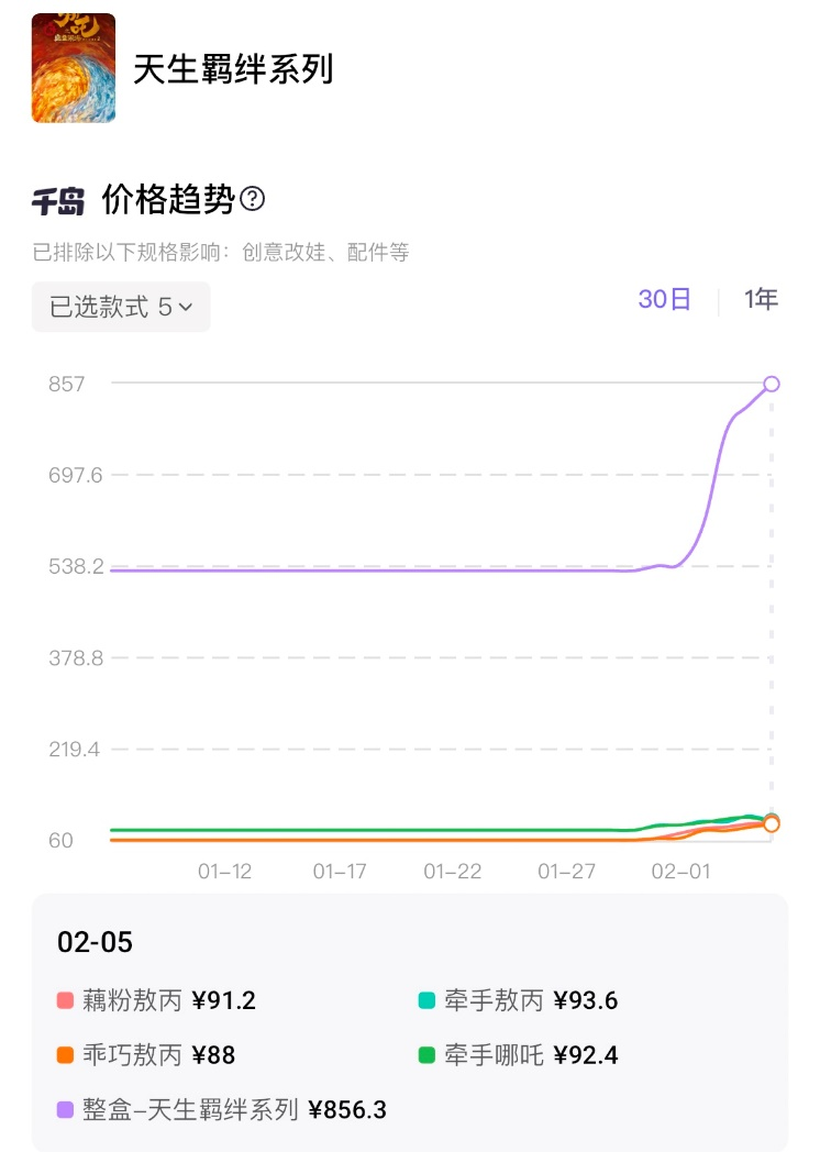 锌刻度通过观察盲盒交易市场发现,泡泡玛特与《哪吒2》联盟的周边盲盒已经出现轻微溢价,例如最热门的“牵手哪吒”“牵手敖丙”两款盲盒原价69元/个,目前的交易价在95元/个左右,而这样轻微溢价的价格仅仅只能买到在5月20日之前发货的预售产品,现货价格溢价更多,但由于当前《哪吒2》电影的大爆,“上头”的消费者仍然愿意为之买单。