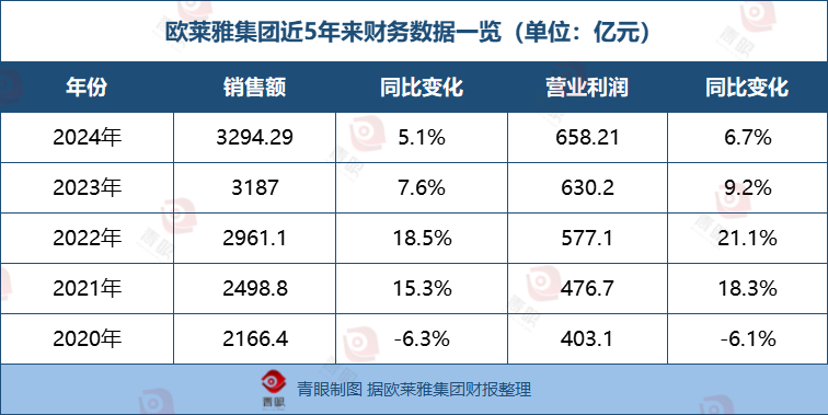 青眼梳理欧莱雅集团过去五年的财务数据发现,2020年-2024年,该公司的销售额和营业利润整体呈稳步增长态势。2024年,欧莱雅集团业绩创下历史新高,销售额达3294.29亿元,营业利润为658.21亿元。
