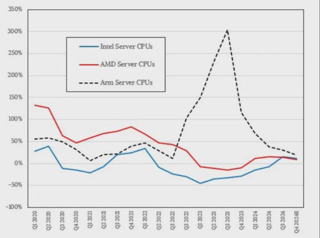 Arm 在科技巨头数据中心的崛起无疑对 2023 年和 2024 年 X86 的出货量造成了影响。一旦超大规模企业在 Arm CPU 部署方面的增长率降下来,企业以及超大规模企业和云构建者就需要更新其老化的 X86 服务器群,即使是英特尔也能实现一些增长。