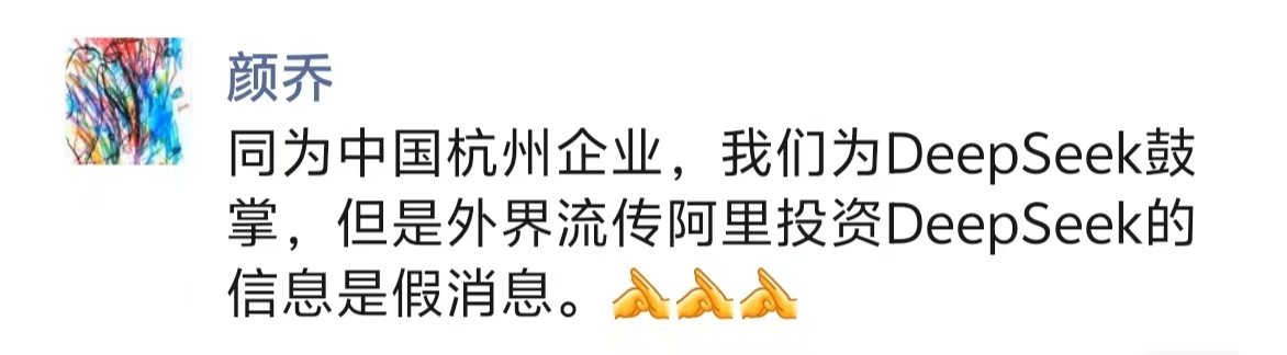 有传言称阿里拟10亿美元投资DeepSeek。阿里巴巴集团副总裁颜乔2月7日在朋友圈对此表示:“同为中国杭州企业,我们为DeepSeek鼓掌,但是外界流传阿里投资DeepSeek的信息是假消息。”