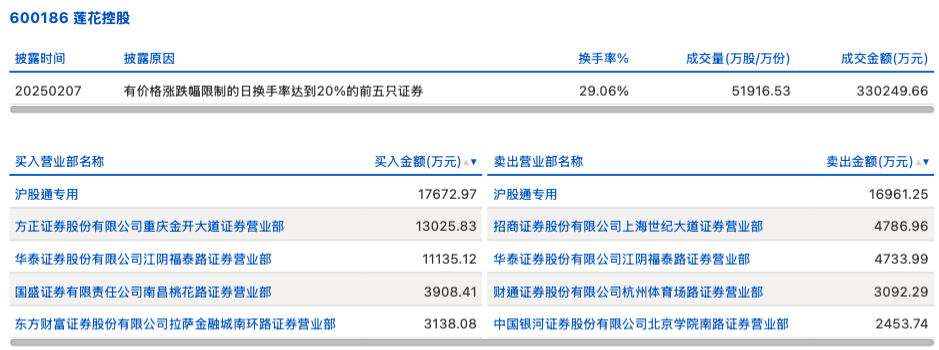 2月7日,莲花控股今日涨停,龙虎榜数据显示,上榜营业部席位全天成交8.09亿元,占当日总成交金额比例为24.5%。其中,买入金额为4.89亿元,卖出金额为3.2亿元,合计净买入1.69亿元。