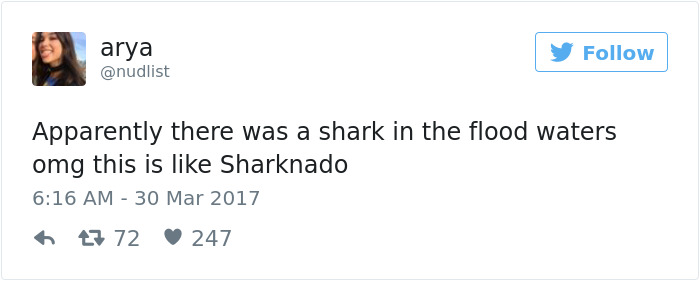 真的有一只鲨鱼在洪水里面。天啊!这就像在看《龙卷鲨》一样。最近,澳大利亚的一场飓风把一条鲨鱼吹到了岸上。这看上去就像电影《龙卷鲨》中的场景:一群鲨鱼被冲刷到一个小镇的街上。