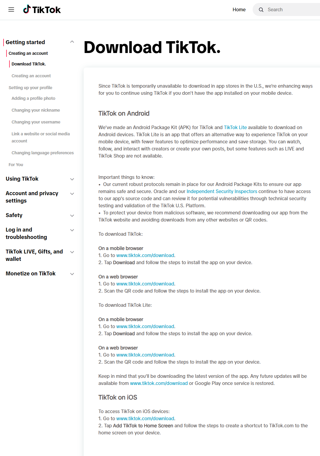 当地时间2月7日,TikTok发布公告称,由于TikTok暂时无法在美国的应用商店中下载,因此为用户制作了一个安卓软件下载包,以供用户在安卓设备上下载软件。用户可以观看、关注、与创作者进行互动或创建自己的帖子,但是某些功能(例如Live和TikTok Shop)不可用。