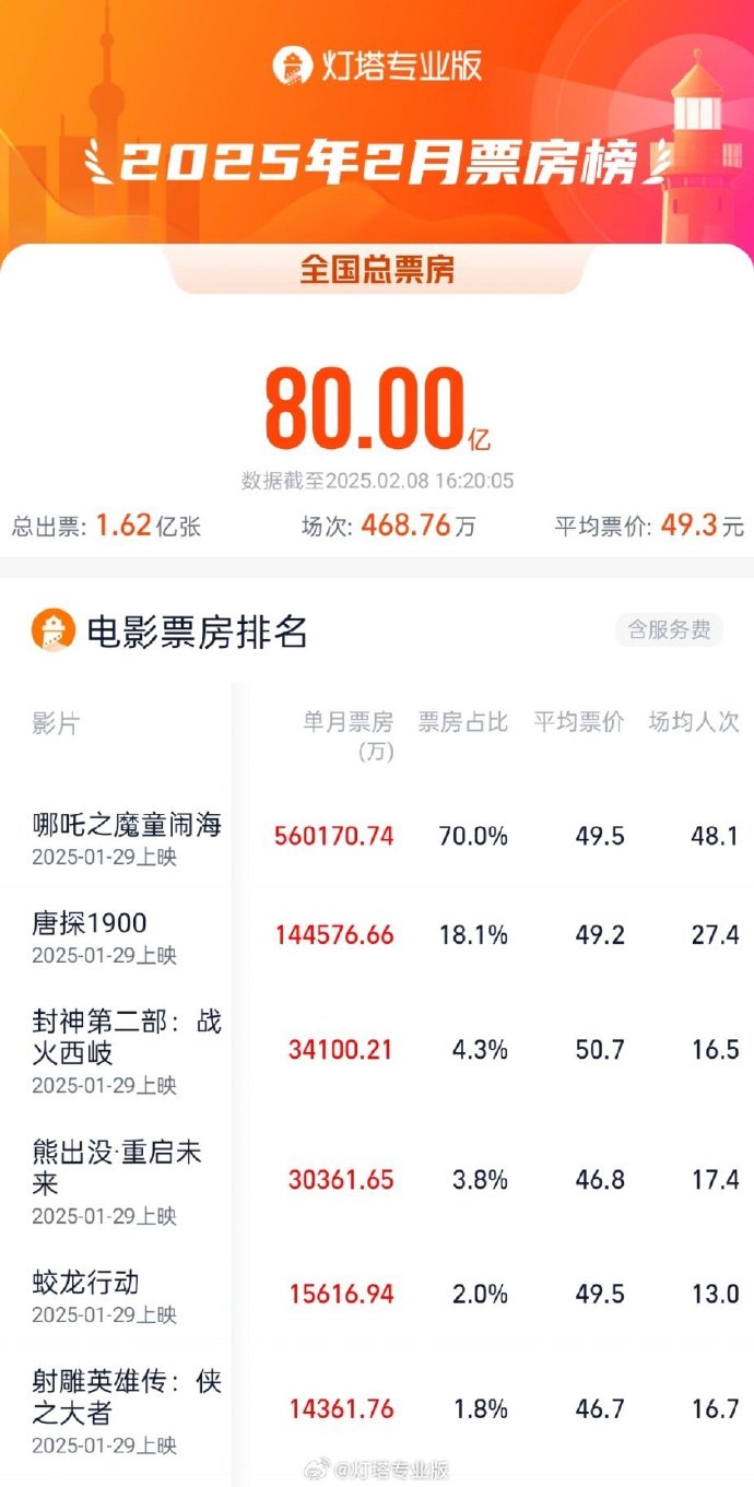 据灯塔专业版,截至2月8日16时20分,2025年2月总票房(含预售)突破80亿。