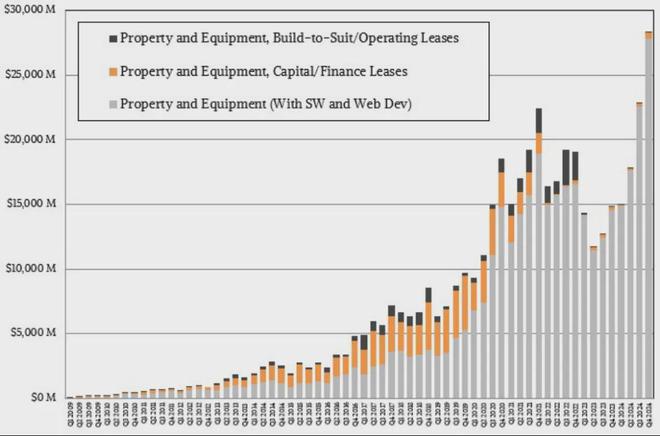 当时,这一比例为每季度数千万美元,随着 AWS 云的增长,这一比例迅速突破数亿美元。自 2008 年第一季度以来,亚马逊已在房地产和设备上投资了 4697 亿美元,这是一个惊人的数字,但如果你考虑到这是亚马逊、微软、谷歌和 Meta Platforms 表示将在本日历年在资本支出上花费的大致数字,你就会发现这笔钱是惊人的。(微软为 800 亿美元,谷歌为 750 亿美元,Meta Platforms 为 650 亿美元,亚马逊为 1000 亿美元。)