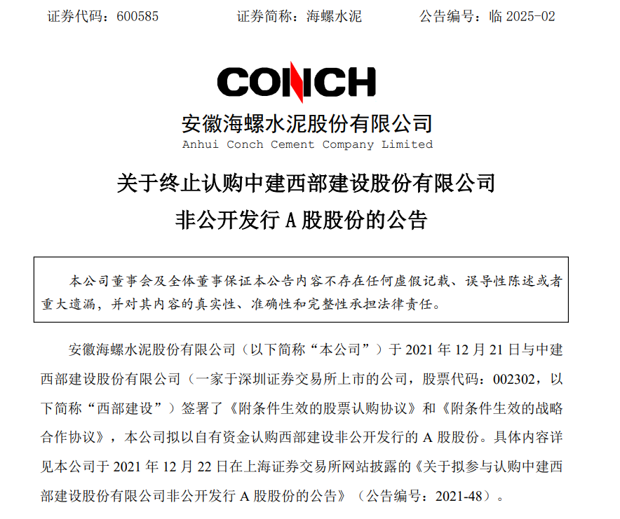 近日,海螺水泥披露终止认购中建西部建设股份有限公司西部建设(SZ002302,总市值:76.37亿元)非公开发行A股股份的公告。