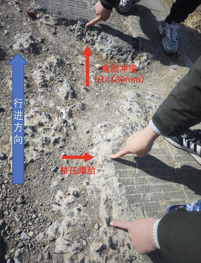 事发时间25年1月30日10点56分,涉事车辆在淮安盱眙一乡村公路上,驾驶员以约70km/h的车速高速过路面(该路段悬挂提醒20km/h限速的标识)。 行至某一破损/坑洼路面,因前述不当驾驶行为,车身部位冲击凹坑边缘,导致车辆右后侧轮胎、轮毂、悬架等部位在冲击后受损。