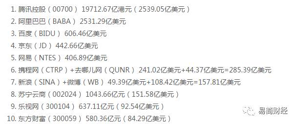 根据2017年最新的互联网公司的市值统计,中国排名前十的公司分别是腾讯的2539亿美元、阿里的2531亿美元、百度的606亿美元、京东的442亿美元、网易的406亿美元、携程加去哪儿网的285亿美元、新浪和微博的157亿美元、苏宁云商的151亿美元、乐视网的92亿美元以及东方财富的84亿美元。