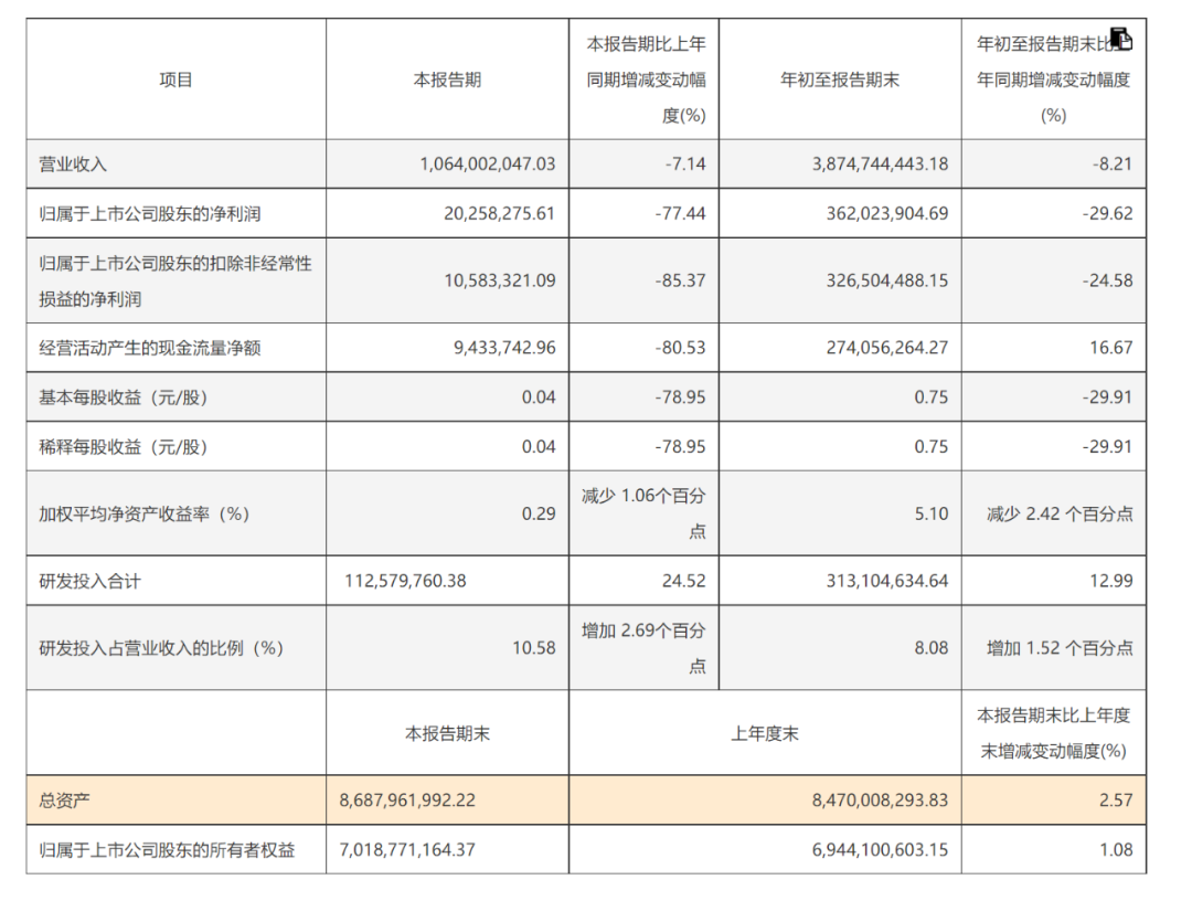 2024年第三季度,华熙生物实现营业收入10.64亿元,同比减少7.14%;实现归属于上市公司股东的净利润2025.83万元,同比减少77.44%,扣非净利润1058.33万元,同比减少85.37%。