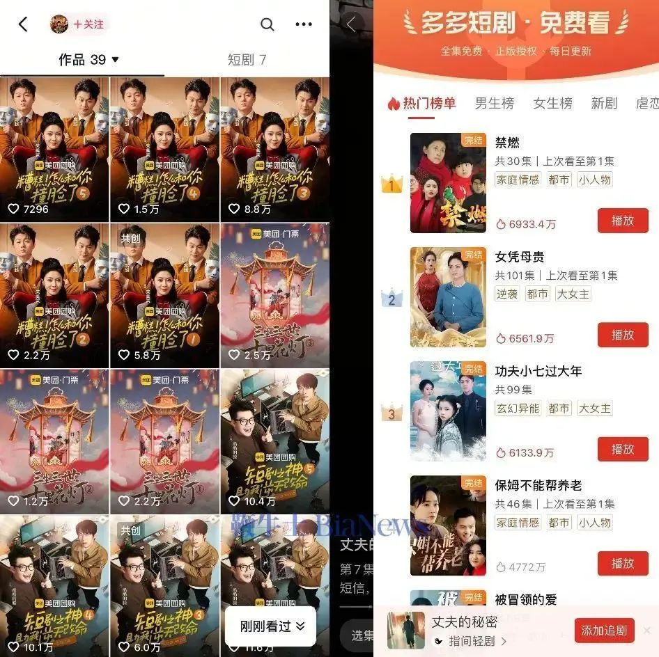 美团则继续和“喜人”联动,推出多部“喜人”主演的自制短剧,但多在抖音播放,品牌短剧居多,从传播效应来看,还是侧重短剧的品牌服务性。