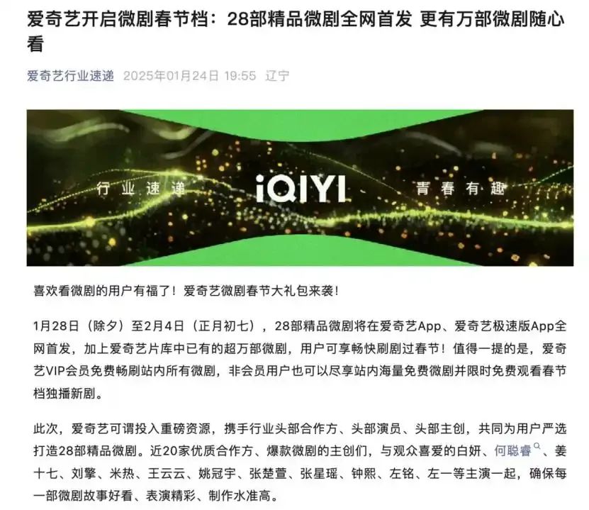 长短视频平台里,红果、抖音、爱奇艺力度较重。抖音动作最早,周期也最长。1月15日抖音开启春节档,周期则从1月15日延续至2月28日;红果在小年夜开启春节档,储备上百部短剧春节档发布;爱奇艺则是在1月24日宣布开启微短剧春节档,将从除夕(1月28日)开始到正月初七(2月4日),在爱奇艺、爱奇艺极速版APP上全网首发28部微剧。