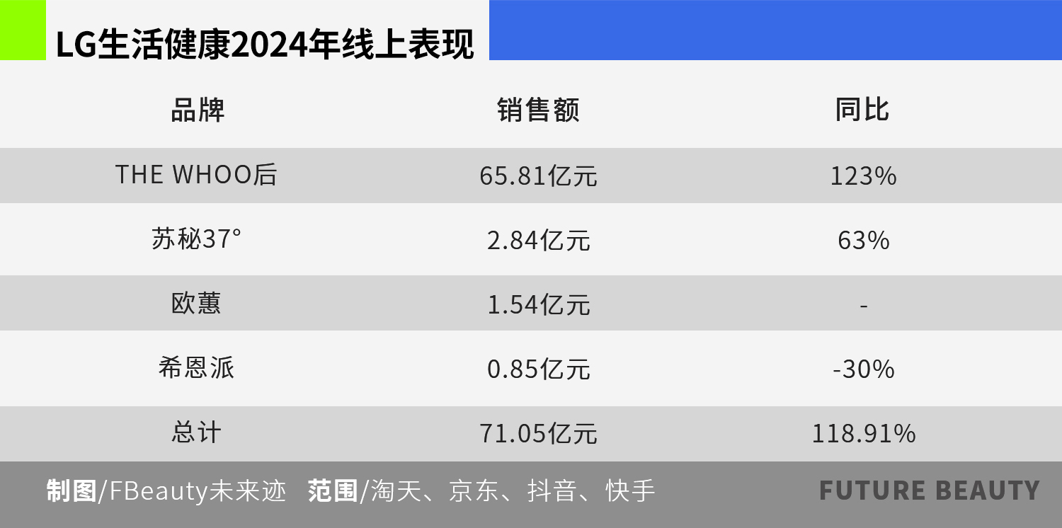 《FBeauty未来迹》整理淘天、京东、抖音、快手这几个平台2024年线上数据情况,发现包含THE WHOO后、苏秘37°、欧蕙、希恩派这几个主要品牌在内的LG生活健康,全年实现了71.05亿元的销售额,同比增长了118.91%。其中,THE WHOO贡献了最大销售额占比,销售额同比增长了123%至65.81亿元。