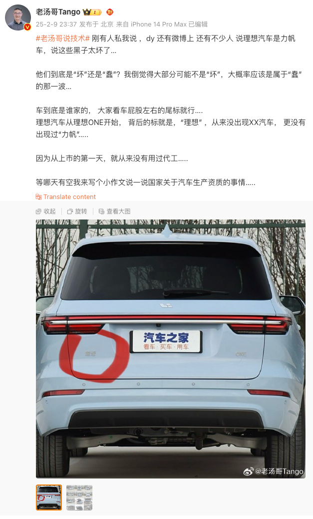 2月9日晚间,理想汽车产品线负责人汤靖在微博发文辟谣称,理想从理想ONE开始,汽车尾部标识就是“理想”,从未出现过其他品牌标识,更没有出现过“力帆”。从上市的第一天起,理想汽车就从来没有用过代工。