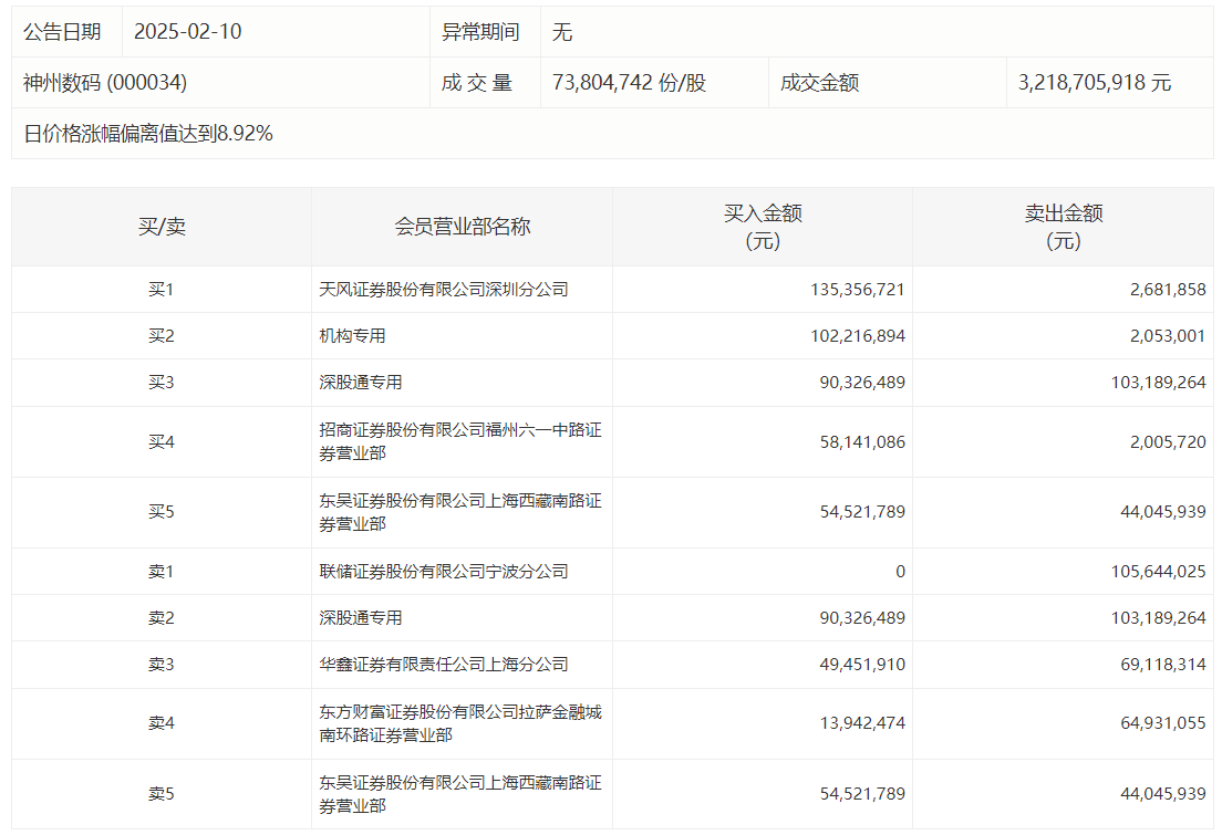 神州数码今日涨停,成交额32.19亿元,换手率13.35%,盘后龙虎榜数据显示,深股通专用席位买入9032.65万元并卖出1.03亿元,一机构净买入1亿元。
