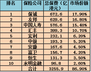 另一方面,与内地保险市场类似,香港保险市场也呈现寡占格局,巨头险企牢牢与其他险企在市场份额方面的差距颇大。新进入者恐难以撼动市场格局。