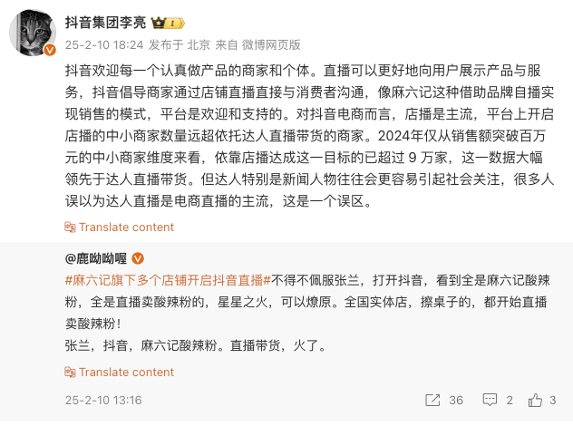 2月10日晚间,抖音集团李亮在微博发文回应麻六记旗下多个店铺开启抖音直播:“抖音倡导商家通过店铺直播直接与消费者沟通,像麻六记这种借助品牌自播实现销售的模式,平台是欢迎和支持的。对抖音电商而言,店播是主流,平台上开启店播的中小商家数量远超依托达人直播带货的商家。”李亮表示,“达人特别是新闻人物往往会更容易引起社会关注,很多人误以为达人直播是电商直播的主流,这是一个误区。”