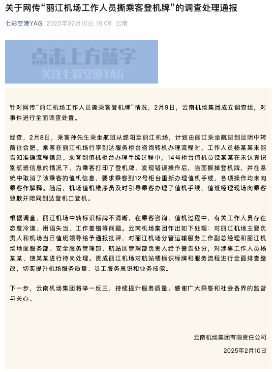 2月10日,云南机场集团有限责任公司发布关于网传“丽江机场工作人员撕乘客登机牌”的调查处理通报。