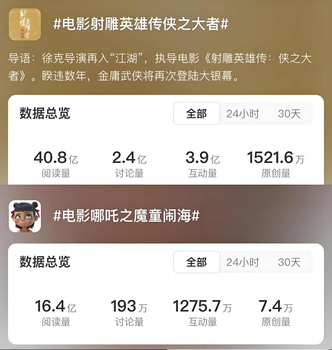 #电影射雕英雄传侠之大者#的话题阅读量达到40亿,讨论量2.4亿,互动量3.9亿。相比之下,#电影哪吒之魔童闹海#的话题阅读量仅16.4亿,讨论量200万,互动量 1275.7万。