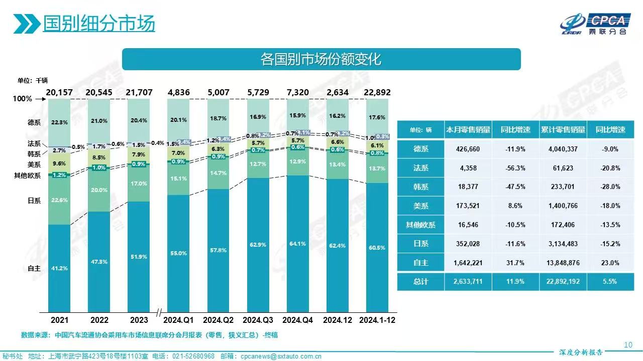 乘联分会数据显示,2024年国产自主品牌的市占率为60.5%,同比2023年增长了近九个百分点,此增长幅度完全抹平了日系品牌于同一时期失去的3.3%的市场份额。