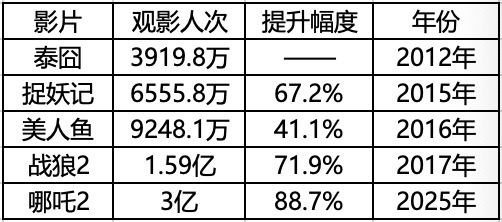 后面的三连击,几乎是一瞬间的事。2015年暑期档《捉妖记》成为了华语电影历史最大的奇迹所在,影片不仅打破了《泰囧》的票房纪录,更是将观影人次提升到了6000万+的级别,提升幅度达到了67%+。做为过度冠军,周星驰在2016年春节档带来了久违的作品《美人鱼》,影片已经拿到了接近1亿的观影人次,中国电影也是进入了30亿+的时代。