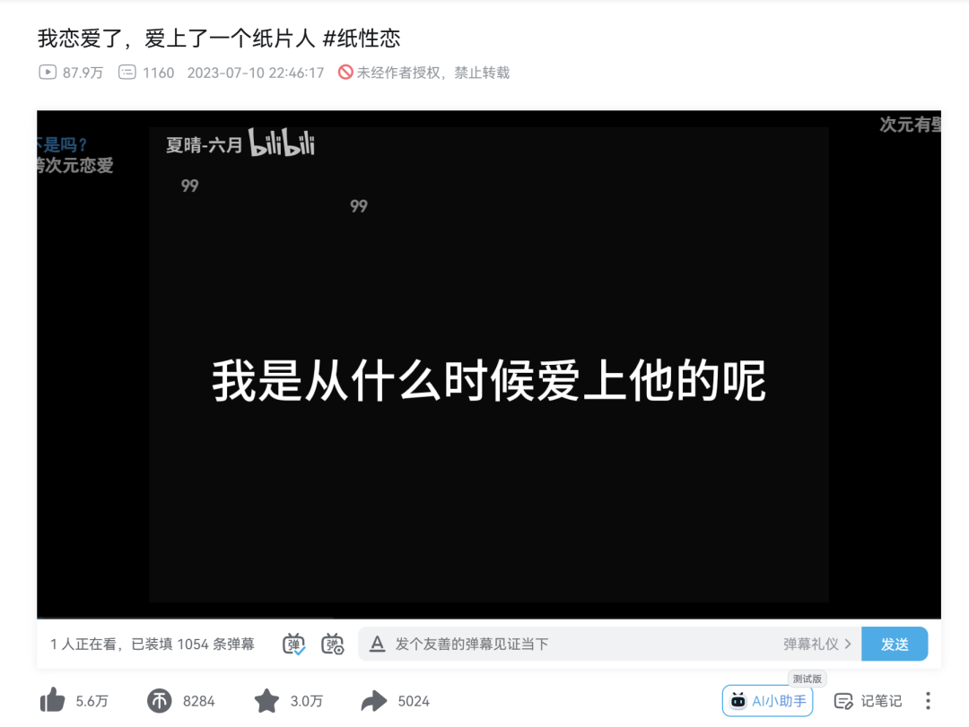2023年7月,一则关于玩家与角色恋爱的视频《我恋爱了,爱上了一个纸片人》在B站收获了超过80万的点击量;2024年,《爱神的箭射穿我,却只和你擦身而过》在B站创造了70万点击量。同时,在国内规模最大的女性文学网站晋江文学城中,“纸片人” 标签其下的搜索记录多达近300页......