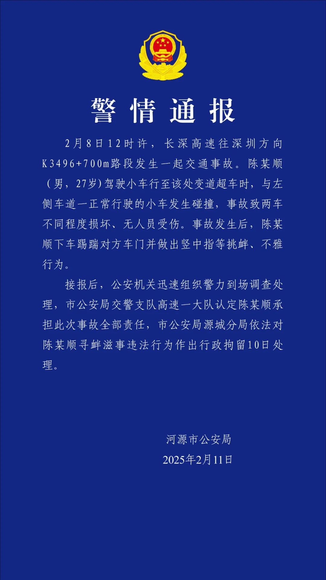 广东省河源市公安局2月11日发布警情通报,2月8日12时许,长深高速往深圳方向K3496+700m路段发生一起交通事故。陈某顺(男,27岁)驾驶小车行至该处变道超车时,与左侧车道一正常行驶的小车发生碰撞,事故致两车不同程度损坏、无人员受伤。事故发生后,陈某顺下车踢踹对方车门并做出竖中指等挑衅、不雅行为。接报后,公安机关迅速组织警力到场调查处理,市公安局交警支队高速一大队认定陈某顺承担此次事故全部责任,市公安局源城分局依法对陈某顺寻衅滋事违法行为作出行政拘留10日处理。