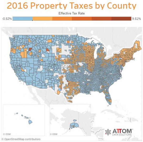 近日,美国最大的房地产数据提供商ATTOM Data Solutions发布了一份2016年房产税的分析报告,该报告对美国逾8400万独户住宅统计显示,2016年对独户住宅征收的房产税总共2777亿美元,平均每户3296美元,实际税率为1.15%。