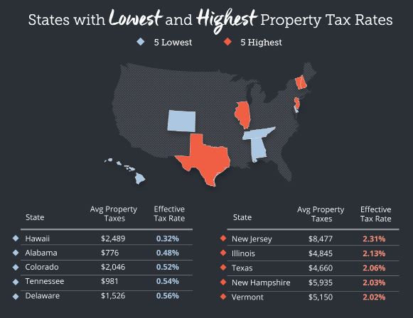新泽西、伊利诺伊州、德克萨斯州、新罕布什尔州、佛蒙特州,实际税率最低的州则是夏威夷、阿拉巴马、科罗拉多、田纳西州、特拉华州。