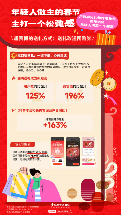 抖音生活服务数据显示,2025年春节,新春团购送礼的用户数和销售额同比提升了125%和196%。除了饮料、烟酒、零食、水果等传统春节送礼标配,年轻人开始更多关注团购券等“新型年礼”。